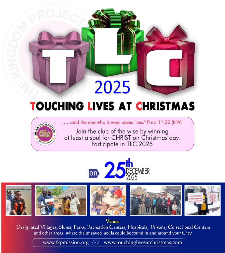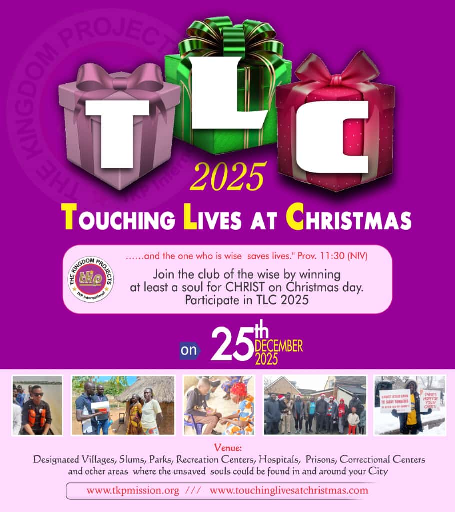 TLC – Touching Lives @ Christmas is an outreach that is held on Christmas day in villages, slums, parks, recreation centers, hospitals, prisons, correctional centers and other areas where unsaved souls could be found. Christians take their food, refreshments and various gifts to such places; eat and offer welfare and medical services to the people who want it and ultimately use those opportunities to preach the Christ of Christmas.